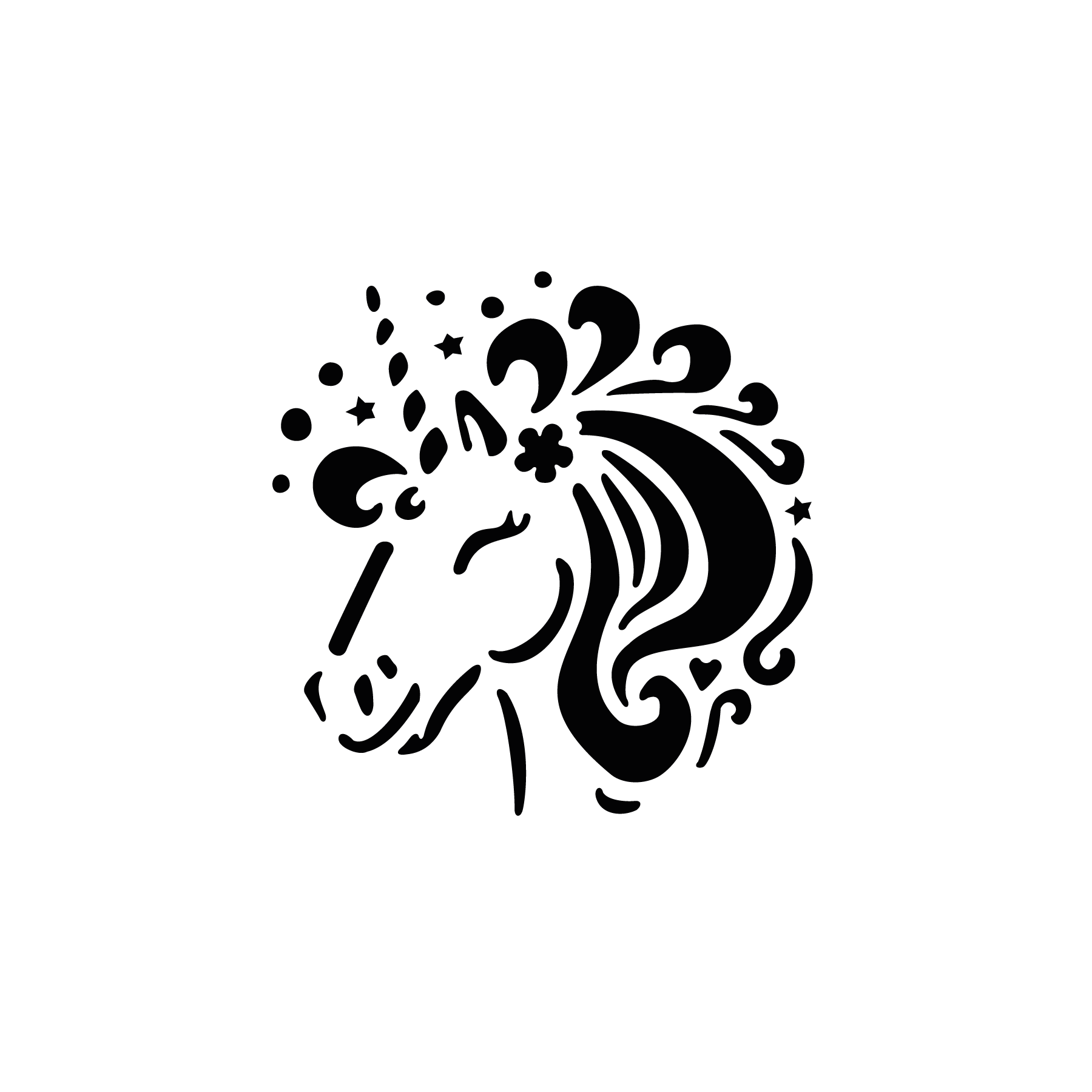 Un tourbillon de formes et de détails entoure la licorne poétique explosion, créant une scène presque onirique. La tête du cheval mythique apparaît au cœur d’une composition riche, accompagnée d’étoiles, de courbes et d’éléments décoratifs qui évoquent un univers magique. Ce pochoir tatouage éphémère permet de réaliser un tatouage temporaire artistique et expressif.